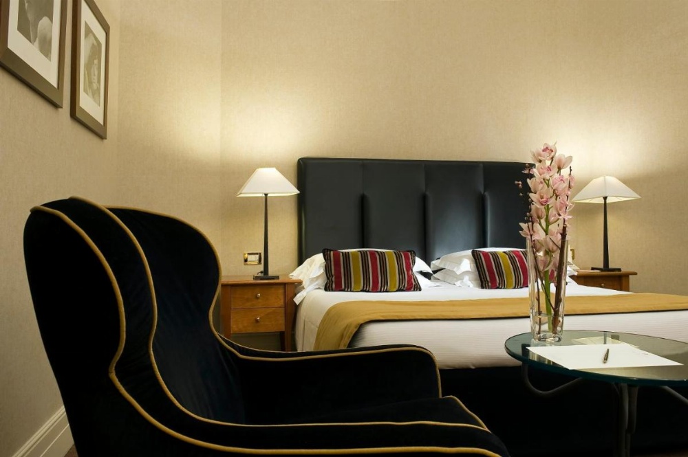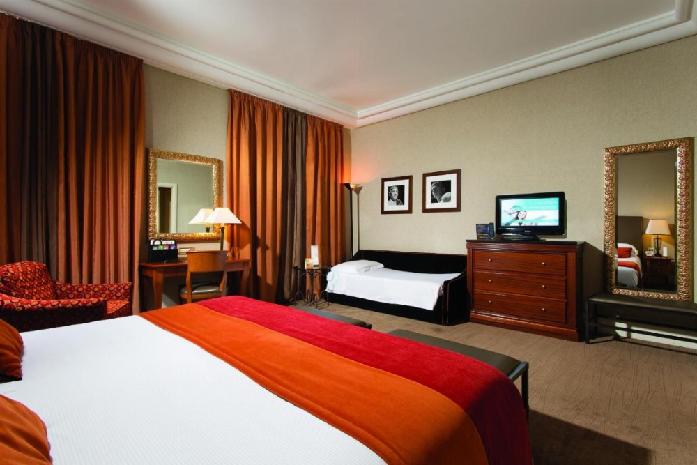 Elegant air-conditioned room decorated in a modern English style. It features an electronic safe, TV with satellite and pay-per-view channels, and a marble bathroom.